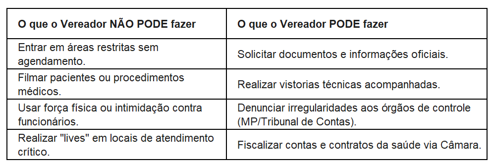 Com a determinação, a administração do hospital e os controladores de acesso ganham respaldo jurídico para impedir a entrada de qualquer parlamentar que não siga os canais institucionais. A fiscalização deve ser exercida de forma colegiada (pela Câmara ou Comissões) e não de maneira "personalíssima" e midiática por um único vereador.