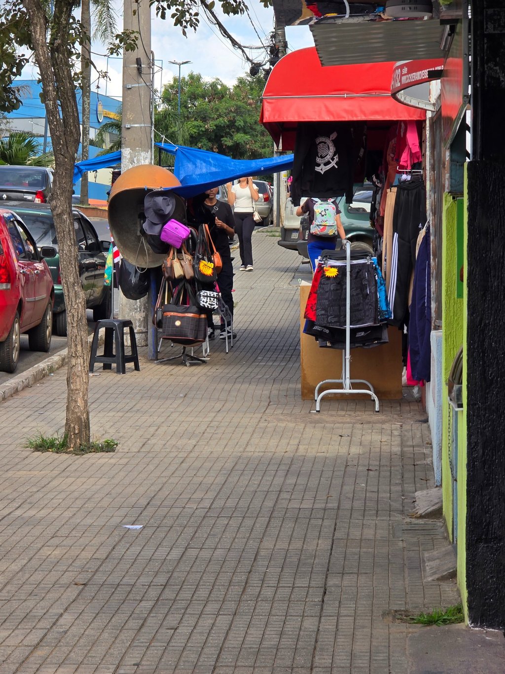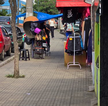 A calçada da Avenida São Sebastião foi literalmente sequestrada. Expositores de roupas, manequins, araras e quinquilharias invadem o espaço destinado aos pedestres, transformando o ato de caminhar em uma gincana arriscada. Para um cadeirante, um idoso ou um pai com carrinho de bebê, a calçada, conforme evidenciam as fotos fornecidas, é simplesmente intransponível, forçando-os a disputar espaço com veículos na rua, expondo-se a acidentes. Esta prática não é apenas uma desorganização; é uma clara e flagrante violação do Código de Posturas Municipal, que proíbe expressamente "embaraçar o trânsito ou molestar os pedestres" nos passeios, um direito básico de ir e vir garantido por lei.