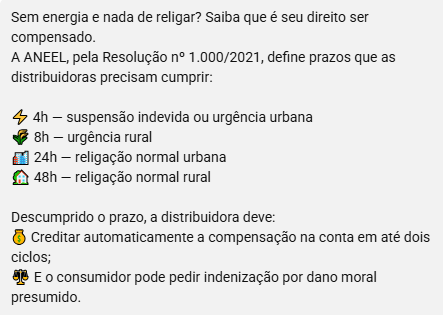 Sem energia e nada de religar? Saiba que é seu direito ser compensado. A ANEEL, pela Resolução nº 1.000/2021, define prazos que as distribuidoras precisam cumprir: ⚡ 4h — suspensão indevida ou urgência urbana 🌾 8h — urgência rural 🏙️ 24h — religação normal urbana 🏡 48h — religação normal rural Descumprido o prazo, a distribuidora deve: 💰 Creditar automaticamente a compensação na conta em até dois ciclos; ⚖️ E o consumidor pode pedir indenização por dano moral presumido. Se inscreva no canal @brunnogiancoli pra saber como exigir seus direitos na prática.